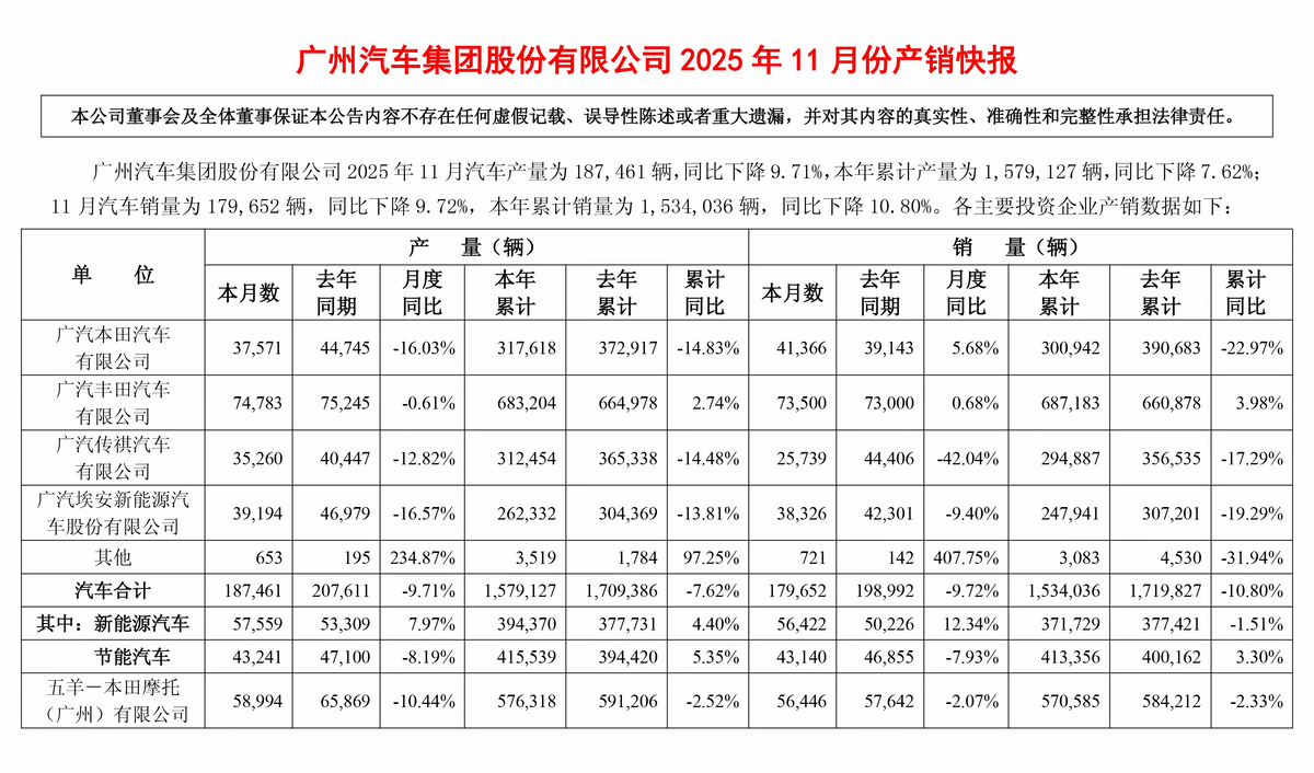 事實(shí)上,埃安i60的銷量遇冷,并非孤立現(xiàn)象,而是廣汽埃安2025年整體市場表現(xiàn)疲軟的一個(gè)縮影。今年以來,埃安的銷量下滑態(tài)勢并未得到有效遏制,反而呈現(xiàn)持續(xù)惡化的趨勢。廣汽集團(tuán)銷量快報(bào)顯示,11月廣汽埃安整體銷量為3.8萬余輛,同比下滑9.4%;1-11月累計(jì)銷量24.7萬余輛,同比下滑幅度高達(dá)19.29%。更嚴(yán)峻的是,在此之前埃安已連續(xù)5個(gè)月出現(xiàn)同比下滑,其中5月同比下滑39.91%,9月同比跌幅也達(dá)到18.6%。截至9月底,埃安1-9月累計(jì)銷量僅18.87萬輛,僅完成2024年全年銷量的50%左右。在新能源市場滲透率已邁入60%的行業(yè)爆發(fā)期,埃安的銷量表現(xiàn)不僅與乘聯(lián)會(huì)大盤走勢差距明顯,更在激烈的市場競爭中不斷丟失市場份額,與曾經(jīng)“新能源黑馬”的形象相去甚遠(yuǎn)。