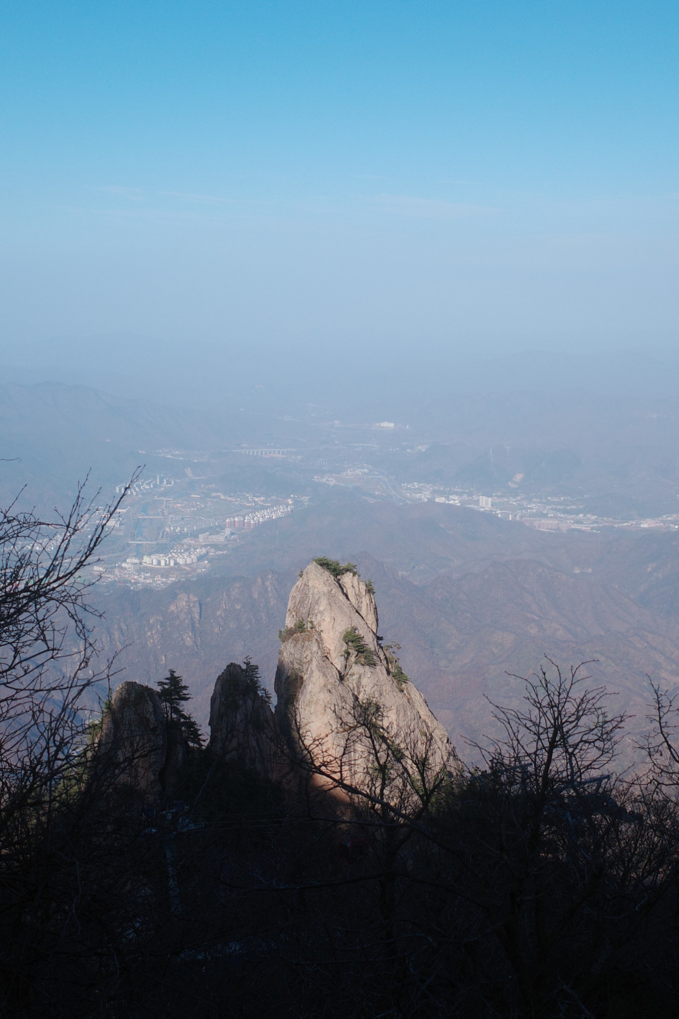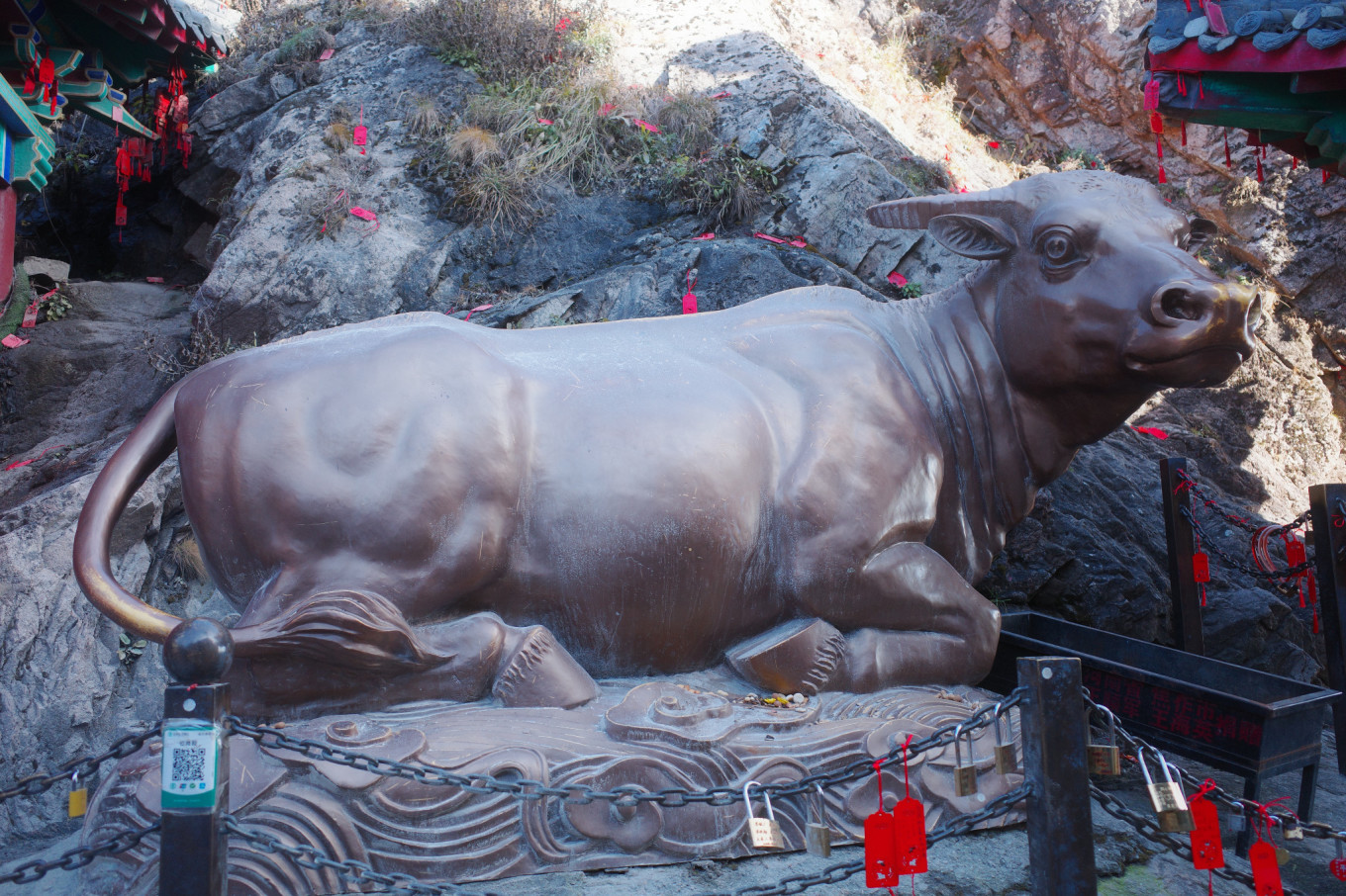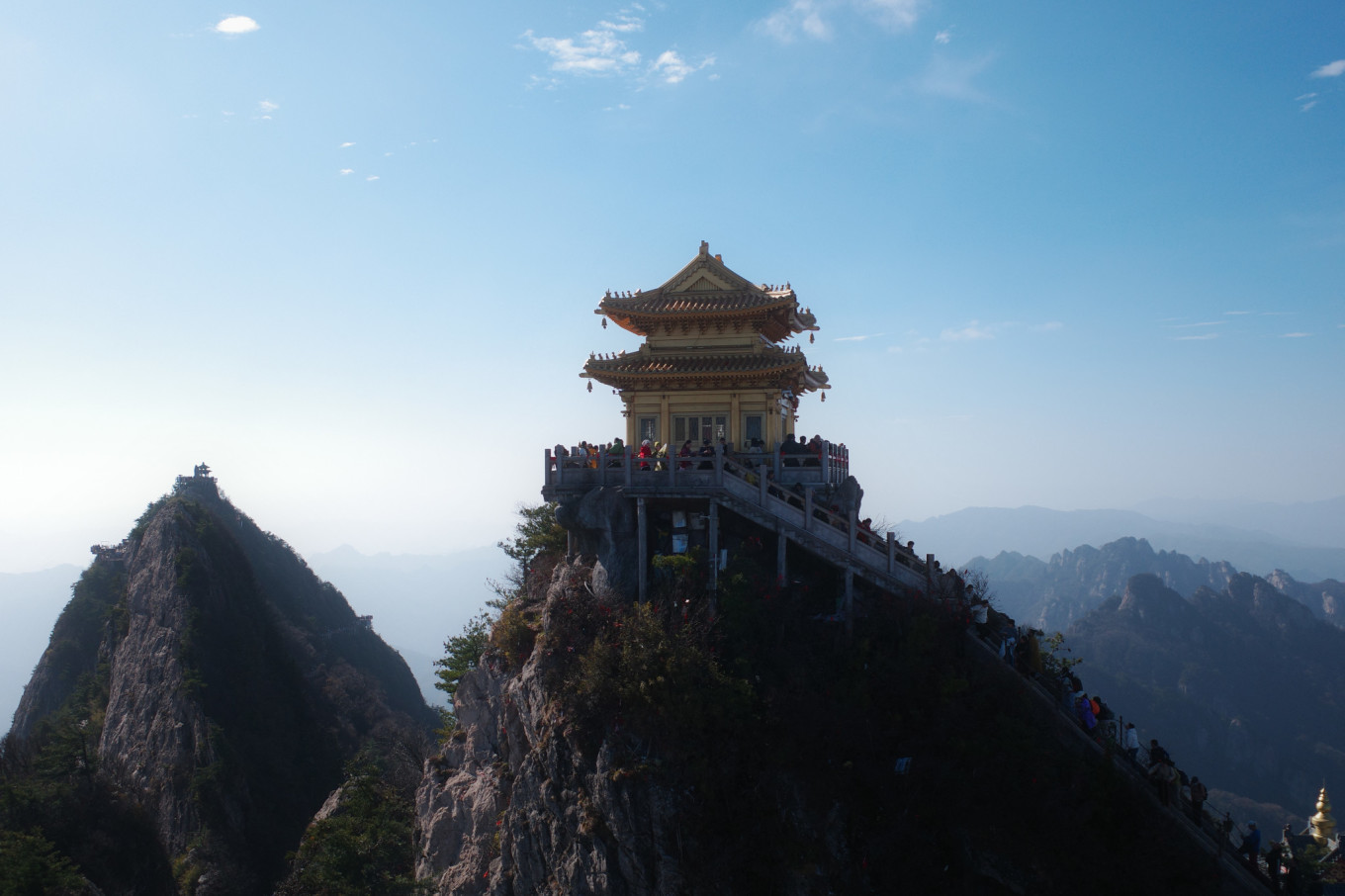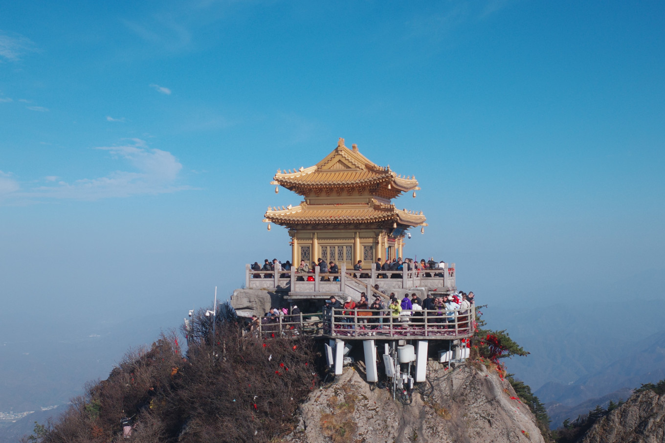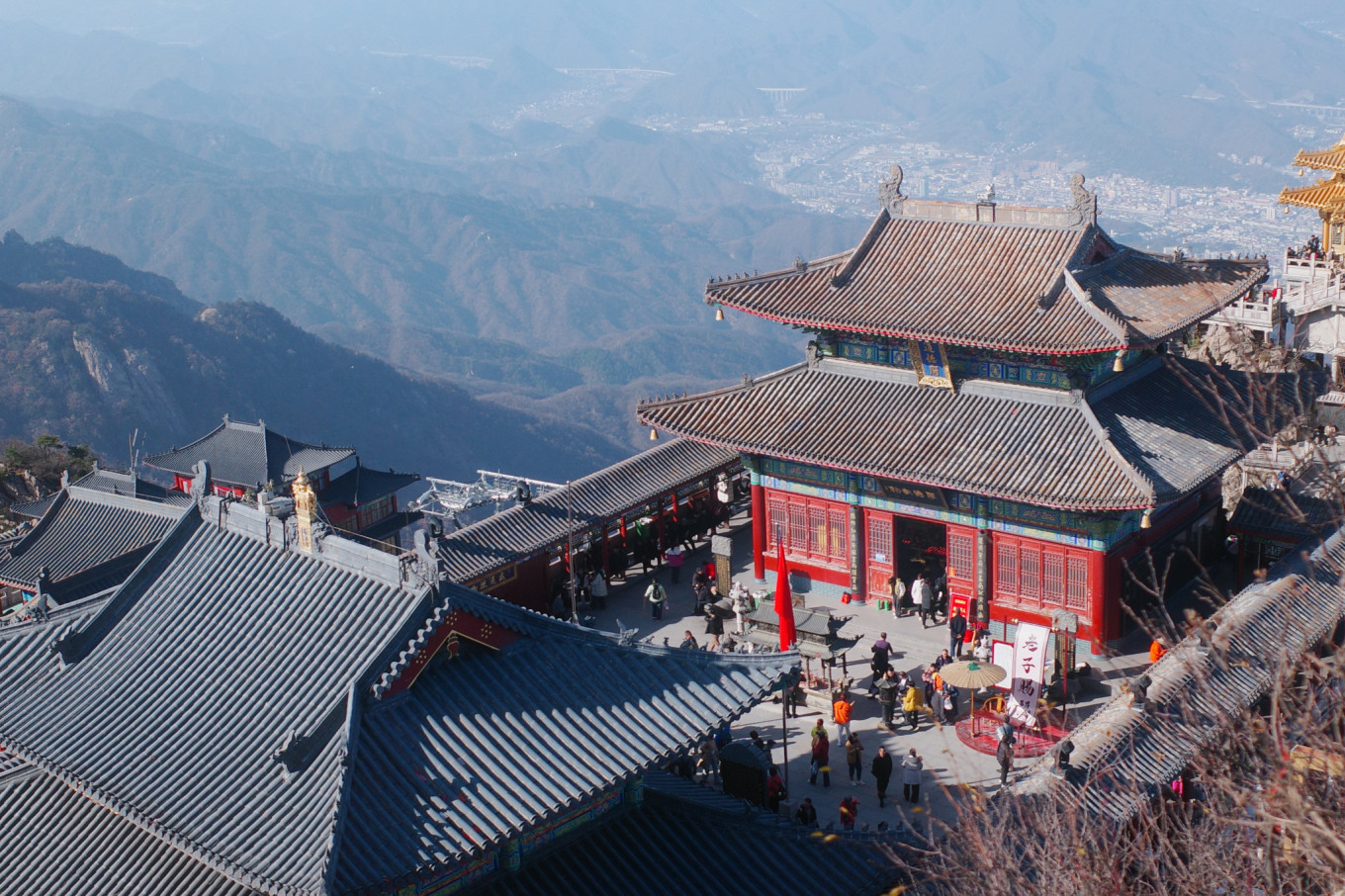 玉皇頂海拔2197.9米,因峰頂有玉皇殿而得名,重歇山式建筑,全銅裝修,殿內供奉玉皇大帝、太白金星、托塔李天王銅像,銅浮雕《玉帝宮外游》。殿聯為:地闊天尊一心成仙圣,山詩水賦百姓做好人。