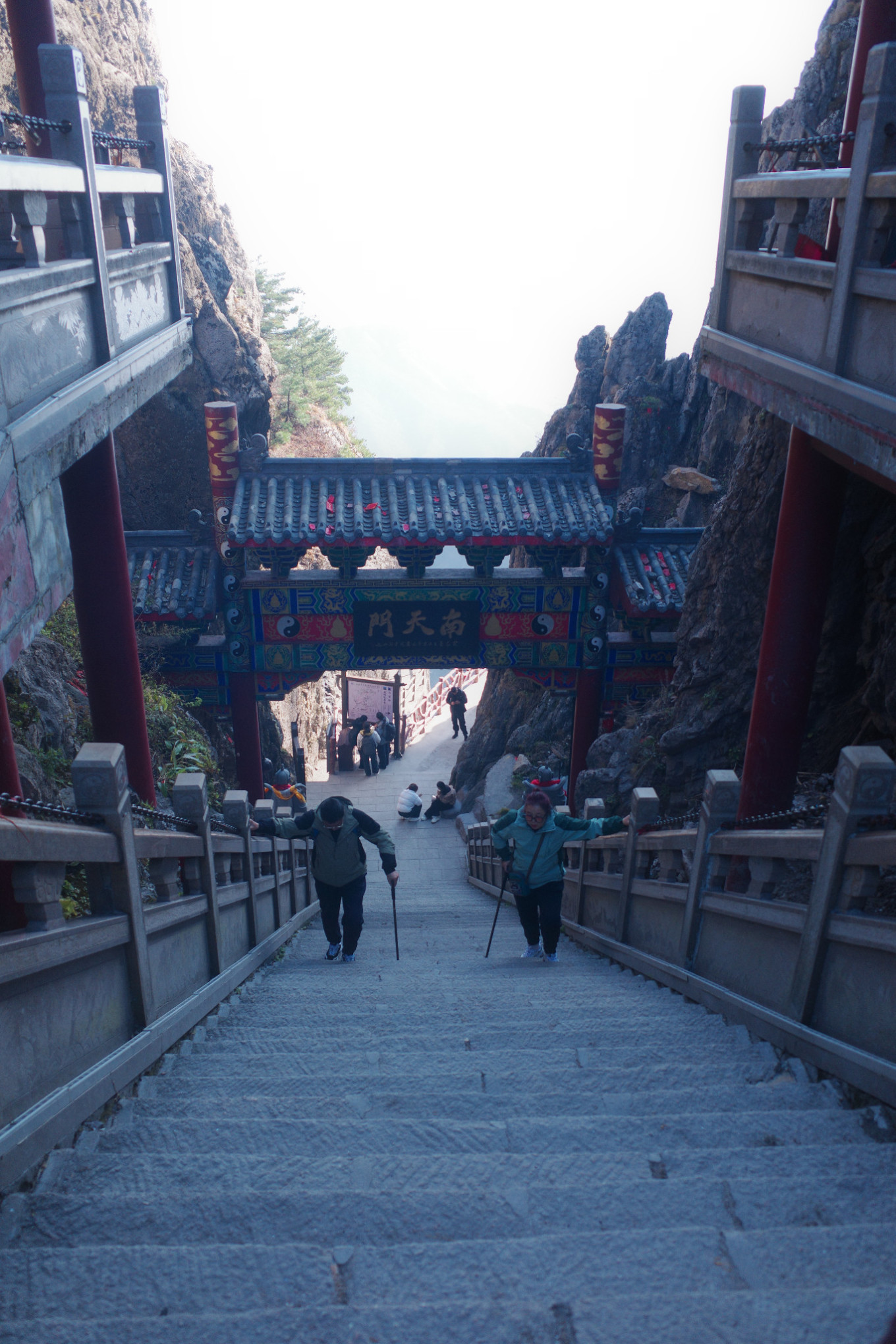 老君山的南天門是自然形成的, 雙峰 對峙,中間形成一處自然天闕,它的坐標指著正南正北,與子午線平行。登上66級臺階,通過南天門,就來到了天界五宮的核心建筑老君廟。