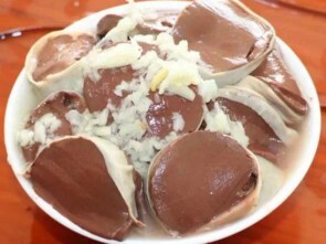 內黃灌腸屬于豫菜系,是河南安陽內黃縣的傳統小吃,他被列入安陽市非物質文化遺產。他是用豬血、豬腸、面粉、香油和五種香料做成的。