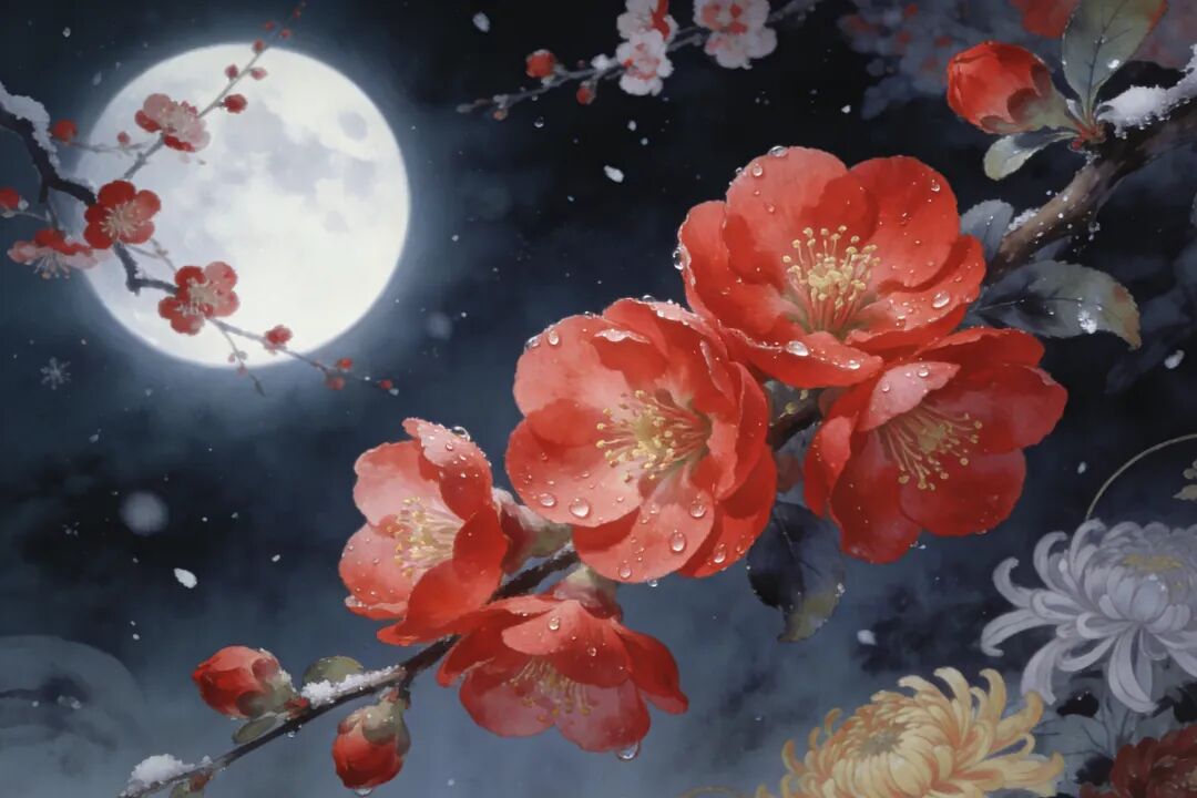 這首詞以冬日反常綻放的海棠為歌詠對象,在擬人化的精妙描摹中,賦予其超越時令的卓然風骨與鮮活生命力。開篇“笑菊欺梅,嫌蜂卻蝶”以動態比擬打破冬日的沉寂,海棠仿佛主動與秋菊冬梅爭艷,連蜂蝶都為之卻步;“壓盡寒荄”更凸顯其凌駕于枯萎百草之上的傲然姿態。上闋“月下精神,醉時風韻”進一步點染其神韻,月光下的清姿與微醺時的嬌態交織,讓“紅透香腮”的色相之美升華為靈動氣韻。下闋“天工造化難猜”借自然奧秘為轉折,詞人自問愁眉未展之際,忽見名花“凌霜帶露”而開,恍若天公特意遣送春訊。這種將個人情緒與自然現象相勾連的筆法,既道出對奇跡的驚喜,更暗含對生命韌性的禮贊。全詞通過“笑菊欺梅—月下醉韻—凌霜送春”的意象鏈,在挑戰節令常規的審美冒險中,讓一朵冬海棠綻放成對抗蕭索、預告生機的精神火焰,最終完成對“反常之美”的詩意正名。(古典詩詞館)
