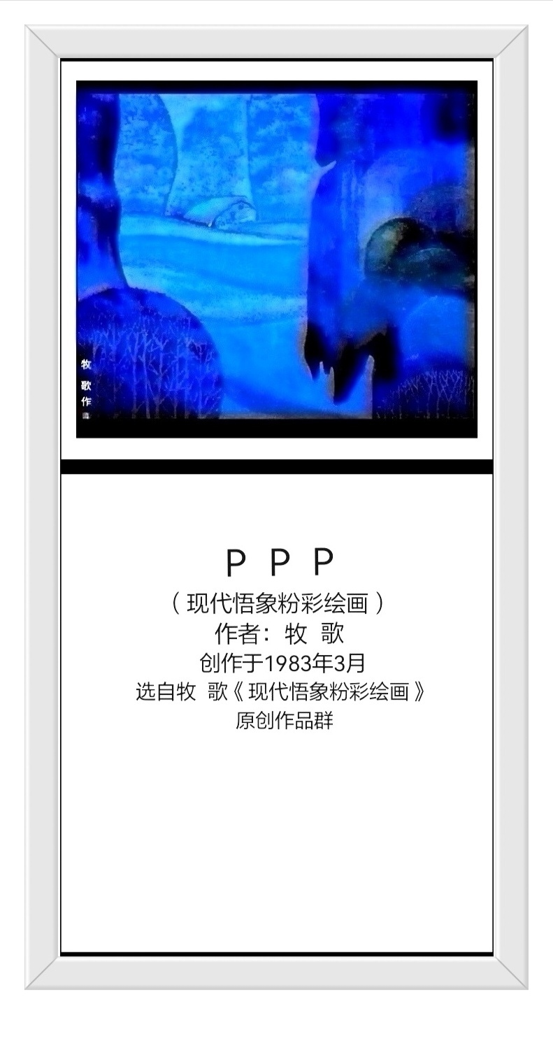-音樂畫作《PPP》,均由其色彩族群的最弱音響和所界定的線形交響而構成。畫面一片寧靜的樹林田園景色,潛伏著生命的意識、情懷......畫中的藍色和它的藍紫、藍綠、藍黑,組成了《PPP》的色彩家族,和諧而溫馨......當天,蒼天集中了所有的沖動與激情,在小屋愛的心頭上印下了察覺不到的一吻,《PPP》的家族興奮起來,優美地吟唱著......這一切,將音樂畫作《PPP》的主題,濃縮到感情最深層的律動,呈現出:色的柔曼,音的深沉,美的含蓄, 大人類、大人生的深邃!