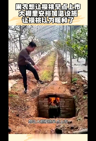 果農想讓櫻桃早點上市,大棚里安排加溫設施,讓櫻桃以為暖和了!