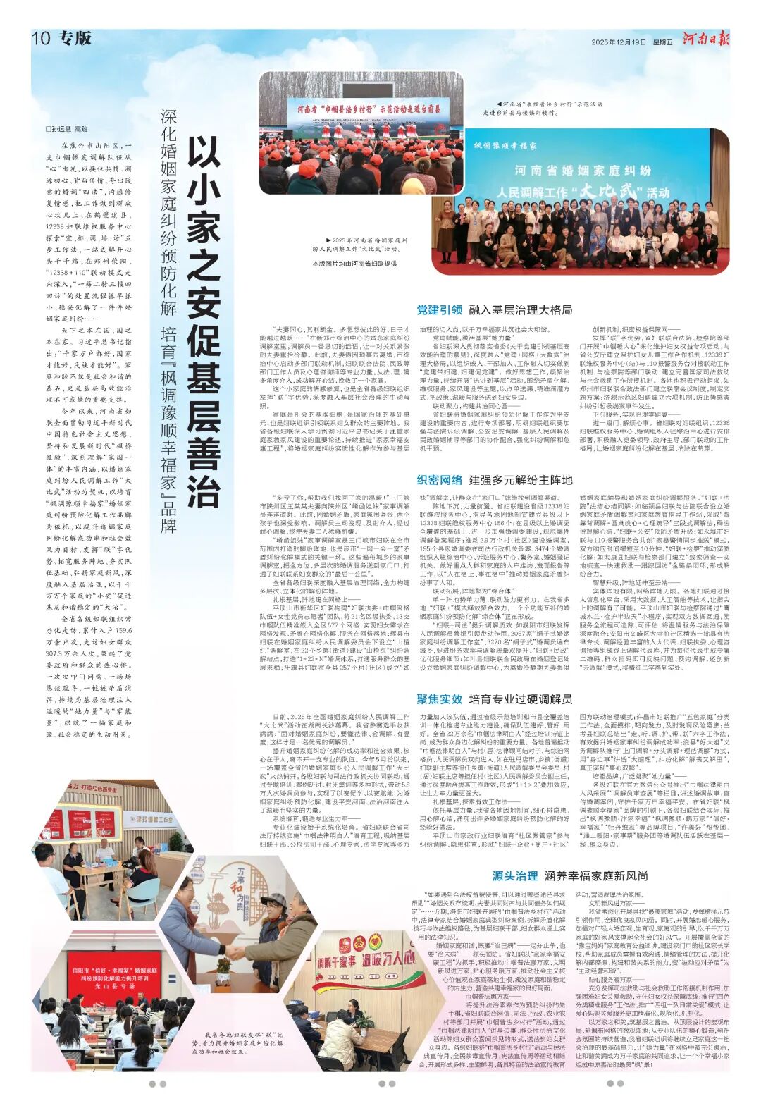 以萬家之和美,筑基層之善治。從頂層設(shè)計(jì)的宏觀布局,到遍布網(wǎng)格的微觀陣地;從專業(yè)隊(duì)伍的精心鍛造,到社會氛圍的持續(xù)營造,我省婦聯(lián)組織將繼續(xù)立足家庭這一社會治理的最基礎(chǔ)單元,讓“她力量”在網(wǎng)格中被充分激活,讓和諧美滿成為萬千家庭的共同追求,讓一個(gè)個(gè)幸福小家組成中原善治的最美“楓”景!