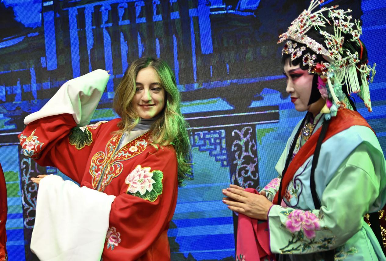 國際媒體采風團成員在吉林市新興園餃子館的京劇舞臺上體驗京劇表演
