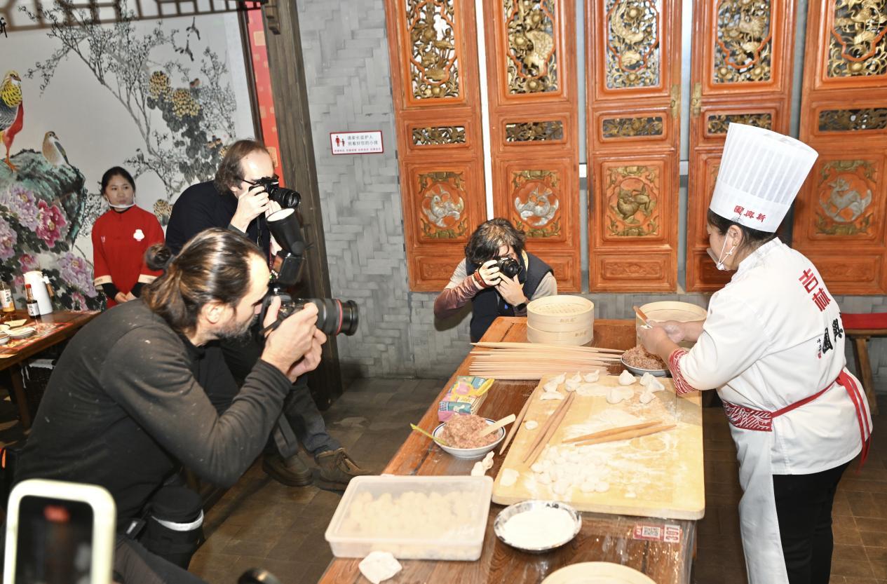 外國媒體記者在吉林市新興園餃子館拍攝包餃子技藝