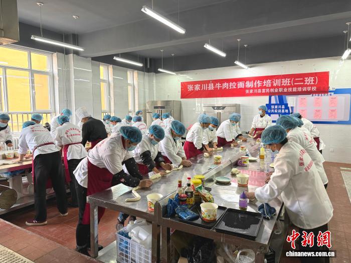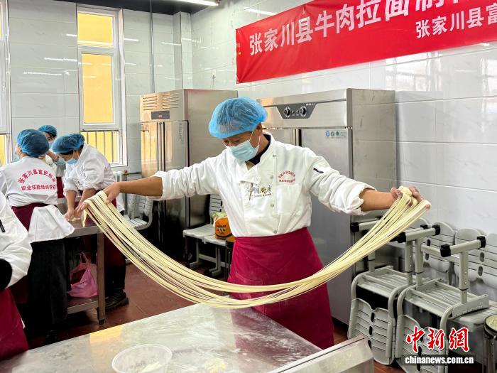 中新網(wǎng)蘭州12月20日電 (馬闐雪 馬德海)“拉面講究‘甩’字訣,手腕發(fā)力要穩(wěn),力道均勻才能拉出粗細(xì)一致的面條!”在甘肅省天水市張家川縣餐飲服務(wù)業(yè)公共實(shí)訓(xùn)基地,牛肉拉面培訓(xùn)班的課堂里熱氣騰騰,學(xué)員們正在老師手把手指導(dǎo)下練習(xí)揉面、甩面技藝。