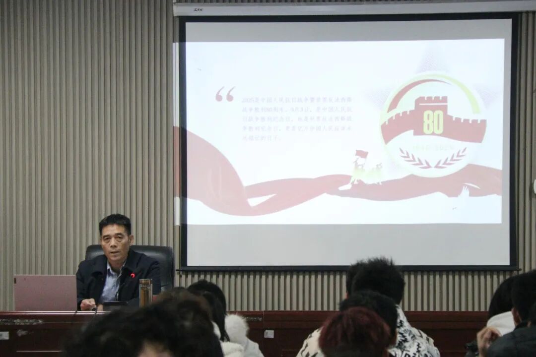 肖紹俊帶領同學們回顧了抗日戰爭的崢嶸歲月,深刻闡述了以愛國情懷、民族氣節、英雄氣概和必勝信念為核心的偉大抗戰精神。他強調,這場偉大勝利有力地證明了中國共產黨是全民族抗戰的中流砥柱,并勉勵青年從歷史中汲取精神力量,筑牢理想信念根基。隨后,他結合全國教育大會精神及《教育強國建設規劃綱要》,系統解讀了以“三大屬性”“六大特質”“八大體系”和“五大關系”為核心的教育強國建設框架,特別指出,作為職業院校,必須緊扣“產教融合的職業教育體系”建設要求,深化校企合作與工學結合,著力培養適應新時代產業需要的高素質技術技能人才與能工巧匠,在服務區域發展和國家戰略中彰顯職業教育的時代擔當與價值。