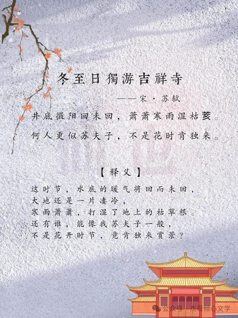 公元1074年冬至,杭州通判蘇東坡獨訪荒園。草木凋敝的寒雨中,他捕捉到地底陽氣初動的生命訊息。這首詩如一枚鑰匙,開啟了蘇軾與冬至深刻的精神對話——在天地陰至極而陽始生的節氣里,一位深陷政治寒潮的詩人,卻始終懷抱著對生命溫暖的執著期待。