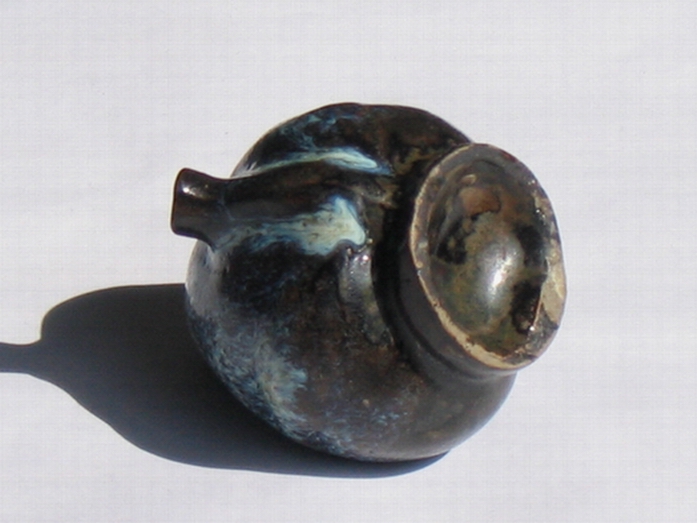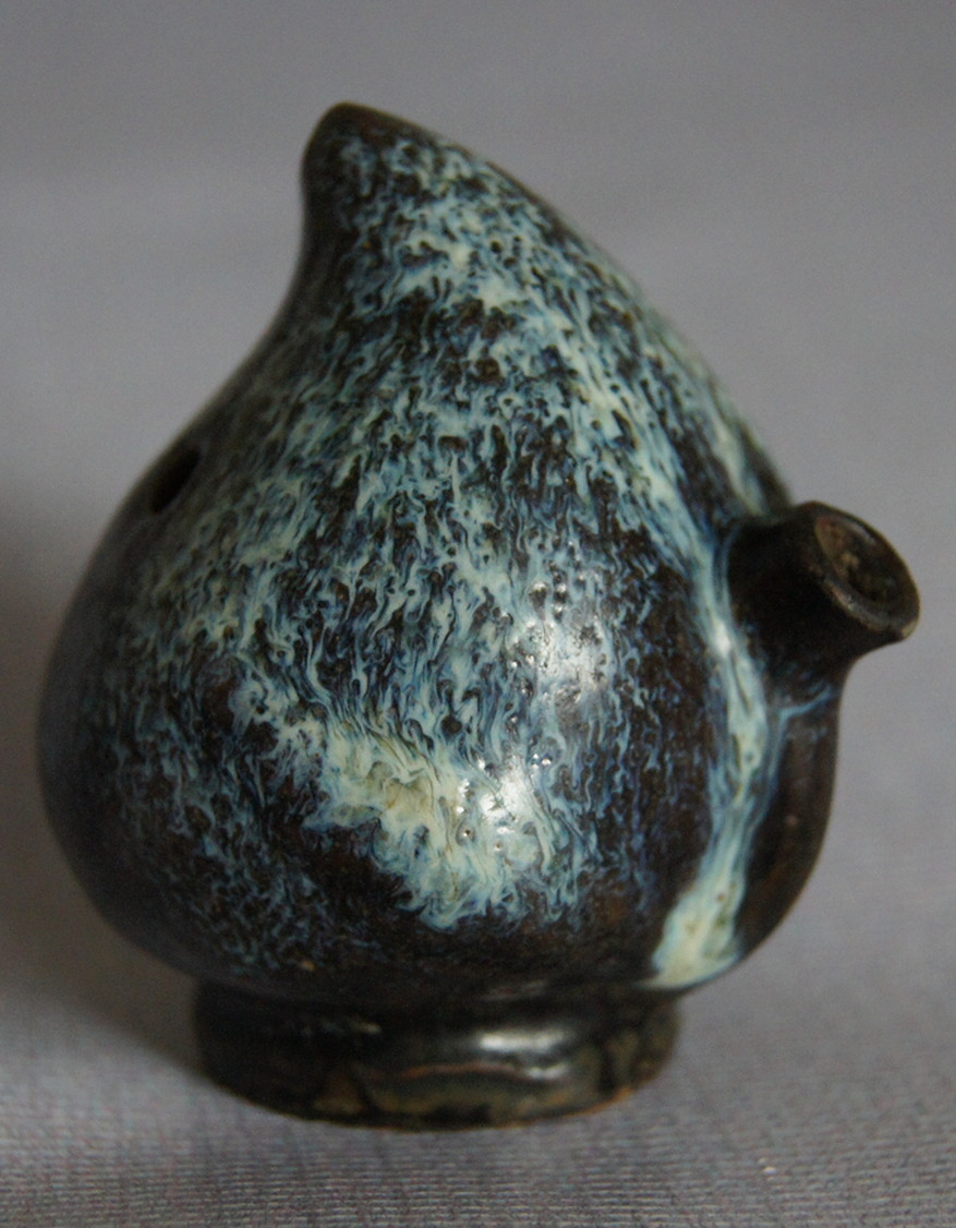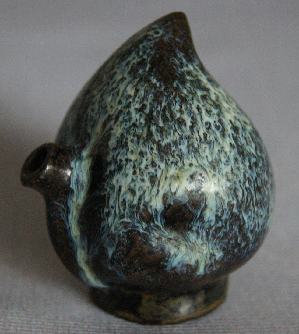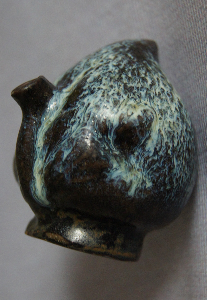 桃型硯滴高6厘米,整體呈桃形,通體施天藍色帶乳白、淺灰色的鈞釉,釉層厚約0.1厘米,積釉處達0.15厘米。其“兩液分相釉”現象明顯,釉面光潔潤亮,底足露胎處呈香灰色胎質,并顯醬褐色護胎釉。