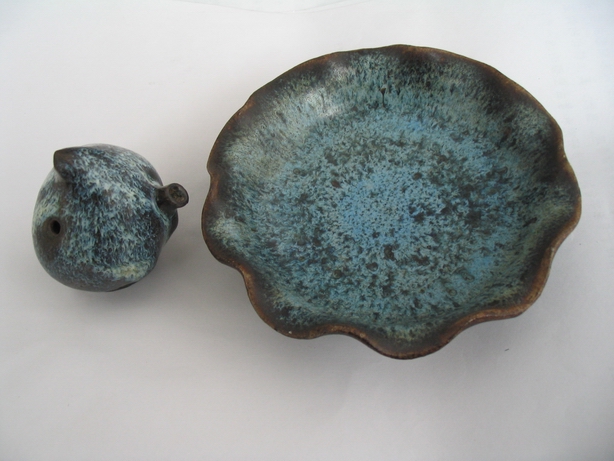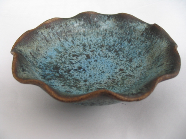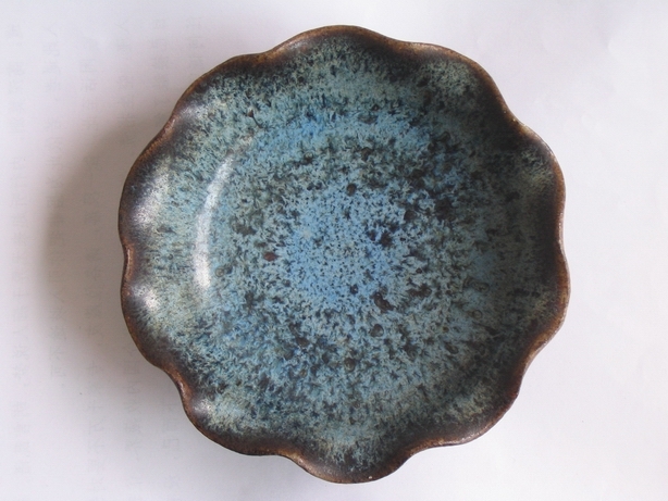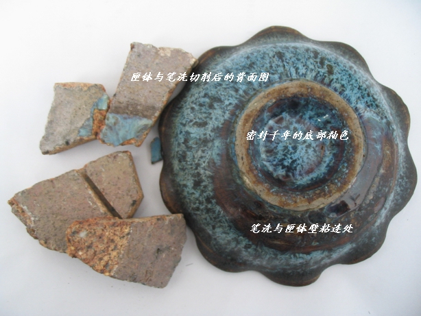 十瓣花口筆洗則更為特殊,其被發現時與匣缽粘連在一起,口徑12.5厘米,高3.5厘米。筆洗通體在褐色護胎釉上施天藍色花釉,釉厚處達0.2厘米,呈現明顯的“紫口鐵足”特征。其十瓣葵口設計是五代時期典型造型,進一步佐證了它的年代。