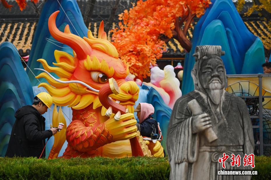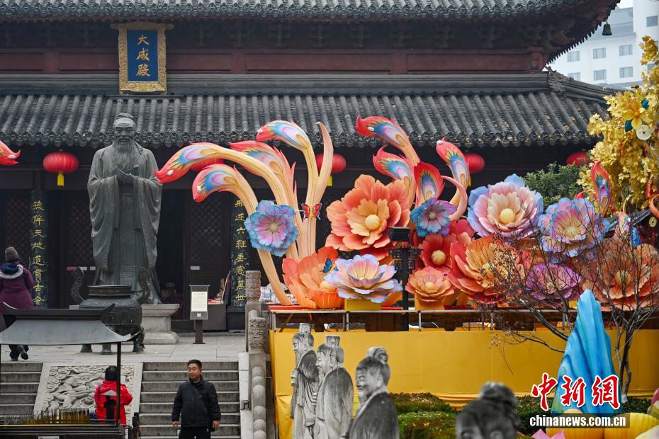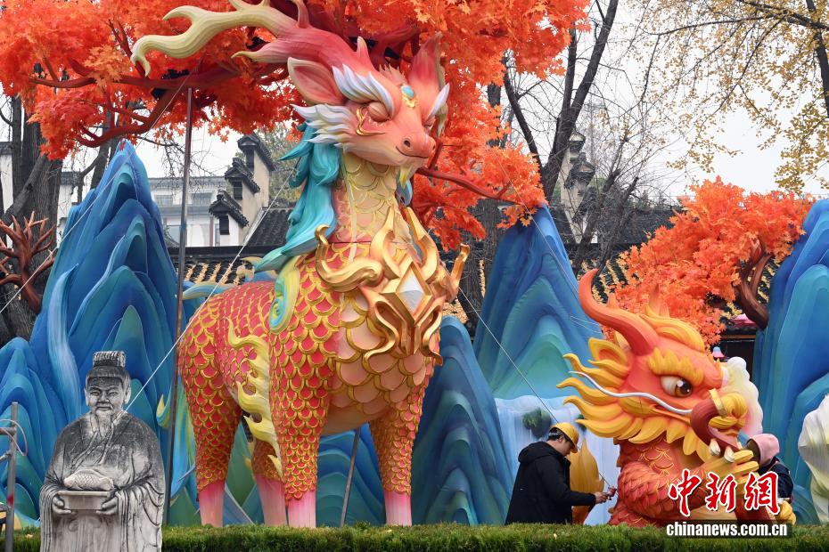 12月20日,江蘇南京,夫子廟大成殿前安裝大型彩燈。近期,南京城南夫子廟、白鷺洲公園開始布置大型彩燈,迎接新年的到來。