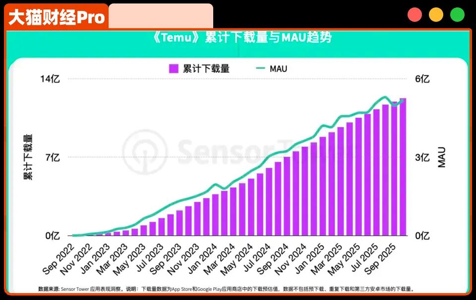 Sensor Tower的數據,今年前10個月,Temu登頂了全球電商應用下載榜和月活用戶成長榜,全球累計下載量突破了12億,而月活用戶(MAU)達到了5.3億,創下了跨境電商的紀錄。