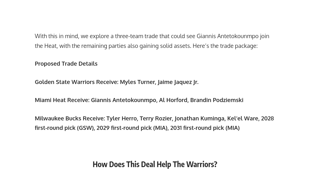 密爾沃基雄鹿隊獲得:泰勒希羅,特里羅齊爾,喬納森庫明加,凱爾韋爾,2028年首輪選秀權(GSW),2029年首輪選秀權(MIA),2031年首輪選秀權(MIA)