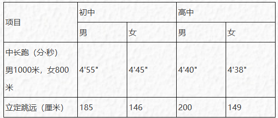 ④體能測試:立定跳遠和中長跑,此項為合格性測試,不計入復試成績,合格標準如下: