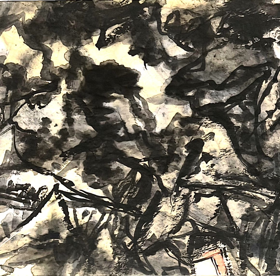 鞠慧在作品中運用了潑墨、積墨、破墨等多種傳統水墨技法,卻又賦予其當代抽象的表達邏輯。潑墨技法的大膽施為,讓濃墨在生宣上自然暈散,形成大面積的墨塊,如雲氣的翻涌、如水波的蕩漾,不施刻意雕琢的痕跡,體現出老子「道法自然」的哲思;積墨技法的反復加筆,則讓墨色在層疊中凝澱出質感,左側濃墨的堆積如「浮生」的厚重與瑣碎,而淡墨的暈散如「半日閒」的輕靈與空濛。破墨技法的運用更為精妙,在墨色未乾之際,以清水或淡墨撞入濃墨層中,使墨色形成「清濁相間」的漸變效果,線條與塊面的邊緣不再僵硬,而是如煙雲般氤氳流動,恰如「閒」的狀態——不是死寂的空無,而是充滿生機的鬆弛與自在。此外,畫面中點綴的淡紅、淺黃色調,並非刻意的設色,而是色墨相融的自然結果,在沉鬱的墨色中點出一抹溫暖,如閒適時光裏的微光,讓抽象的墨象擁有了溫潤的生命溫度。