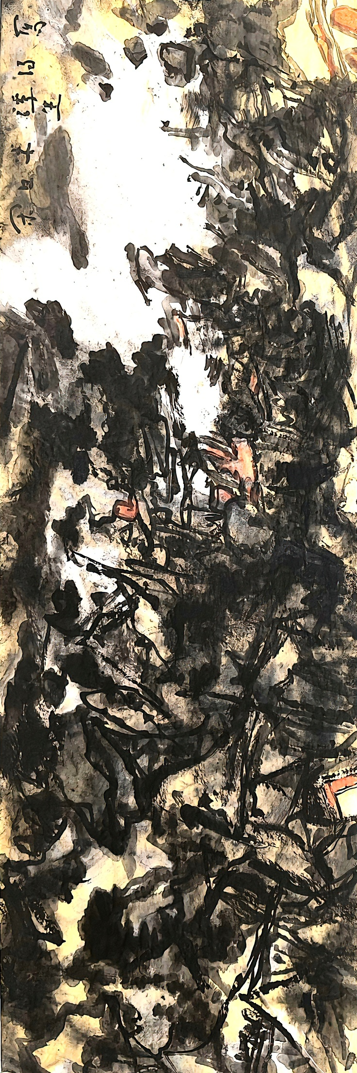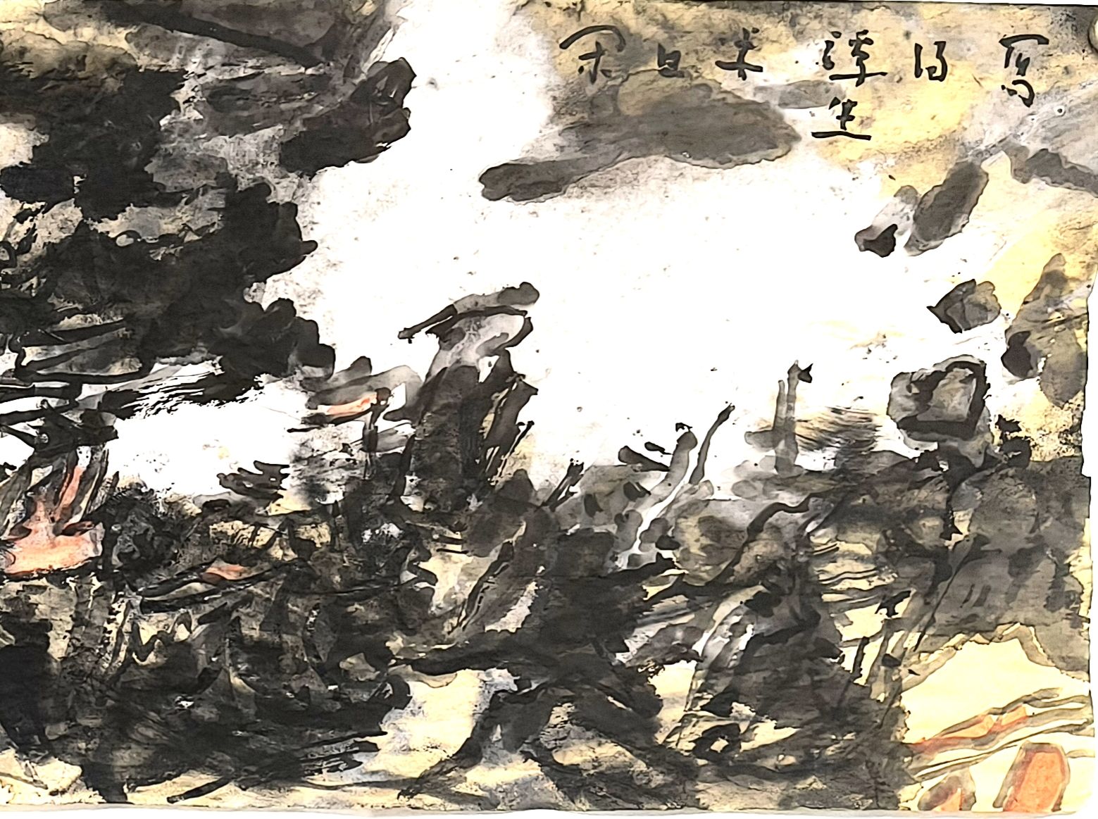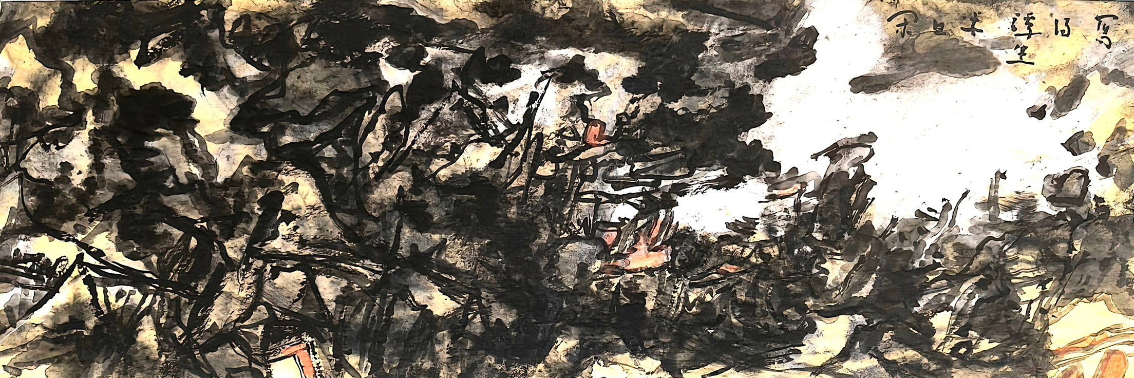 從視覺語言的構建來看,《寫得浮生半日閒》的筆墨技法始終圍繞「閒」的意境展開,將傳統水墨的「寫意」精神與當代抽象的表達方式融為一體。作品採用長卷式的構圖,打破了傳統山水的三遠法則,以墨色的整體流動營造出「虛實相生」的空間感。畫面左側與中部以濃墨、焦墨為骨,粗獷的線條如亂石崩雲般縱橫交織,焦墨乾筆的「飛白」肌理,似枝蔓的糾結、似心緒的紛擾,模擬出現代人日常的喧囂與浮躁;而畫面右側的墨色逐漸疏朗,淡墨的暈染與紙面的空白相互滲透,淺黃、淡紅的色調點綴其間,如陽光穿過雲層灑落的溫暖,又如心靈從紛擾中抽離後的澄澈。這種「濃到淡」「密到疏」的視覺轉換,恰是「浮生半日閒」的意境具象化——從世俗的繁雜走向心靈的閒適,從外在的喧囂歸於內在的寧靜。