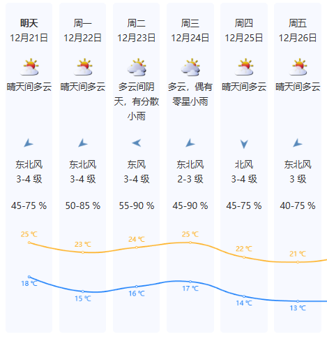 預計12月21日晴天間多云,氣溫18℃—25℃,沿海海區最大陣風6級;