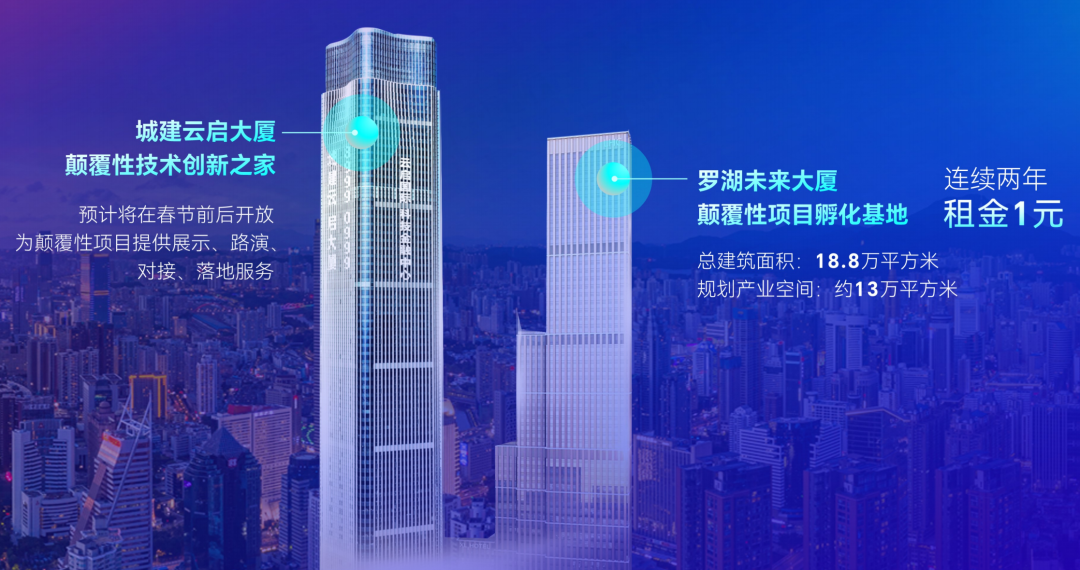 位于城建云啟大廈的顛覆性技術(shù)創(chuàng)新之家,預(yù)計將在春節(jié)前后開放,為顛覆性項目提供展示、路演、對接、落地服務(wù);位于區(qū)委、區(qū)政府對面的羅湖未來大廈,規(guī)劃產(chǎn)業(yè)面積約13萬平方米,將作為顛覆性項目孵化基地,可享受連續(xù)兩年1元租金拎包入駐。