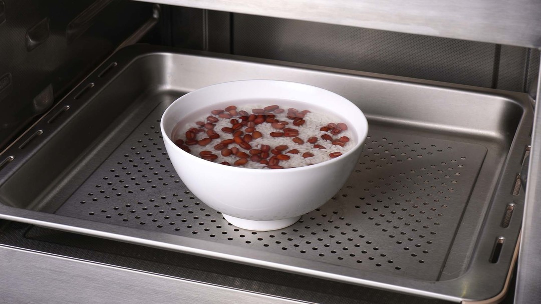 3、糯米紅豆放到一起,水補到1.2倍,放入蒸箱,將其蒸到熟透即可。
