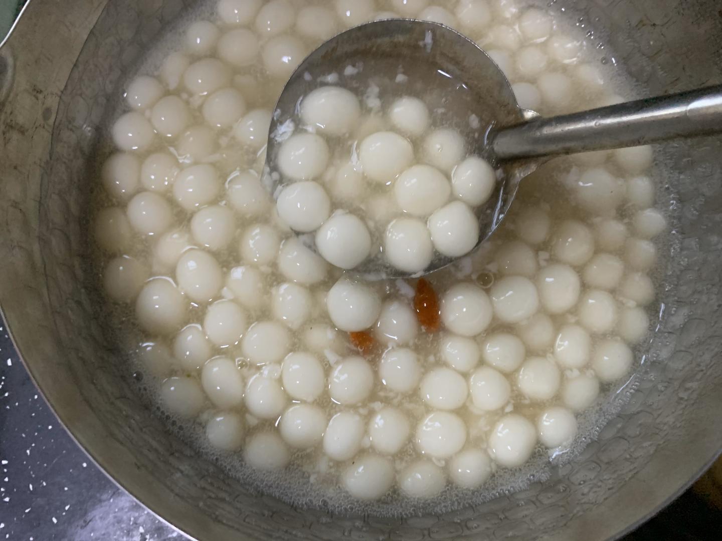 2、鍋里先放水,這個時候多加點,燒開后撒入小圓子,攪拌幾圈,飄起來繼續煮熟。