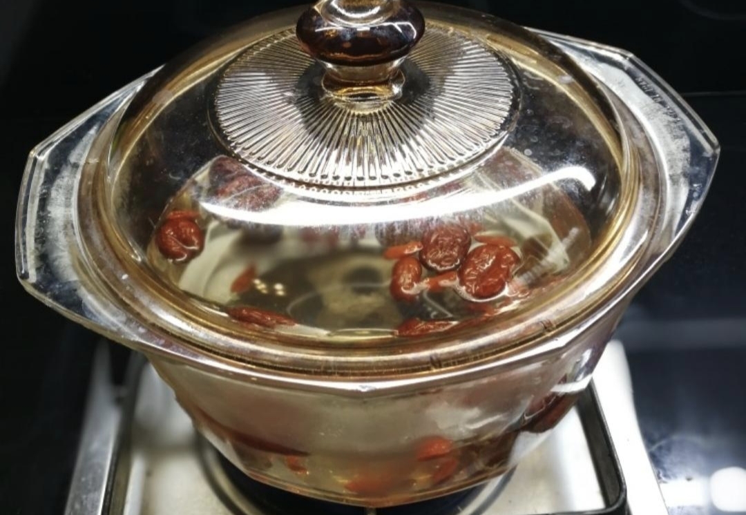 3、先把棗以及桂圓放鍋里,倒上水煮二十分鐘,把枸杞倒里邊,攪勻后關火。