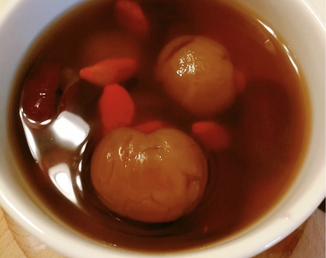 2、桂圓剝五六個,再泡一把紅枸杞。