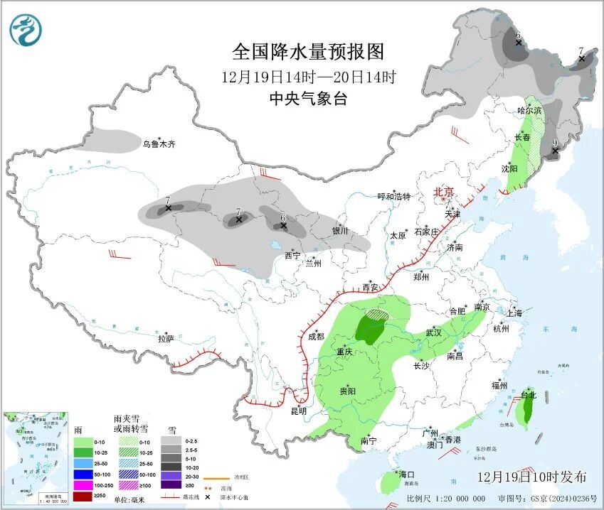 除了沿海,重慶東部和湖北西部一帶,由東向南延伸到長江中下游與云貴高原一帶,都下起了淅淅瀝瀝的小雨和中雨。而降雪主要發生在甘肅的青海,以及東北東部和北部,在中俄邊境和長白山區,有大到暴雪。