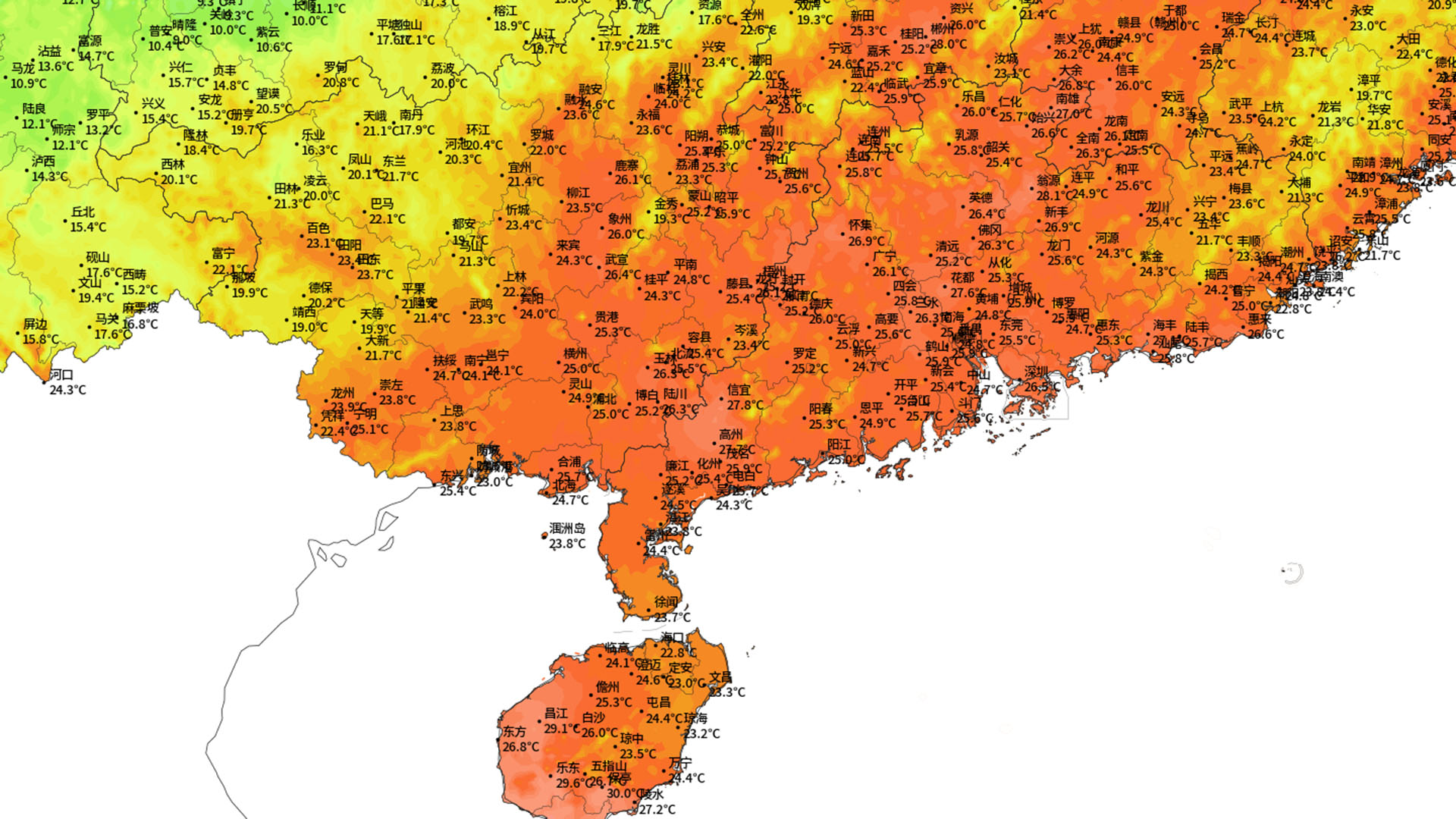 冷空氣到來前,午后華南和江南南部氣溫迅速攀升,14點海南保亭升至30度、廣東高州28度,福建浙江江西湖南廣西云南最高氣溫也突破26度,浙江瑞安還打破了12月最高氣溫紀錄;主要城市中深圳26.7度、福州25.5度、廣州25.3度、海口25.2度、南寧25.1度,讓人完全感覺不出現在已經臨近冬至了!