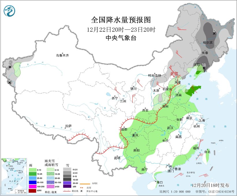 北方,22日夜間至24日雪為主,局地有暴雪。新疆南疆西部山區、甘肅、華北東部、內蒙古東部、東北地區等地將有小到中雪或雨夾雪。東北地區的部分地方可能有大雪;湖北西部山區、重慶東北部等地局地甚至預報有暴雪。