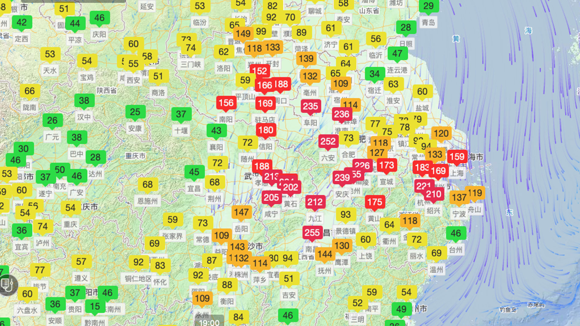 今天傍晚,冷空氣大風的影響下,霧霾南抵上海、杭州、南昌、武漢長江一線。湖北東部、安徽中南部和浙江北部的空氣質量達到或者超過重度污染水平。長三角地區因為靠近大海,所以僅依靠海風就能讓所有污染散去。