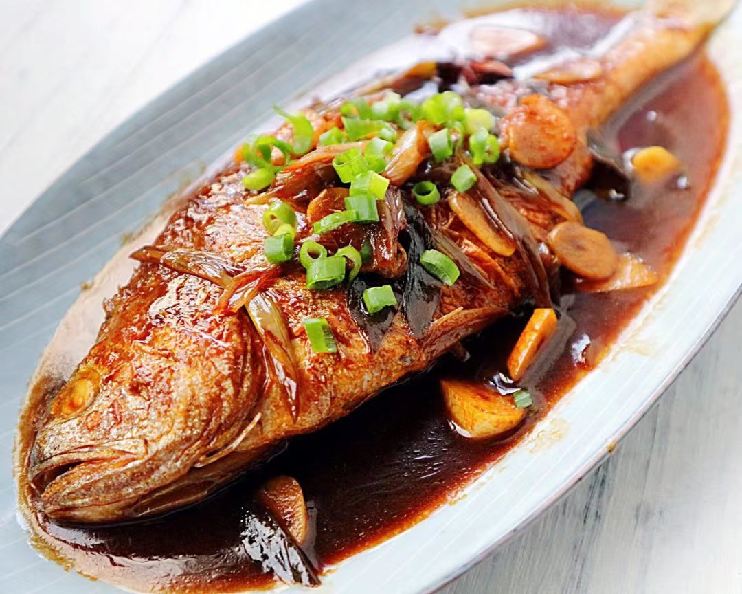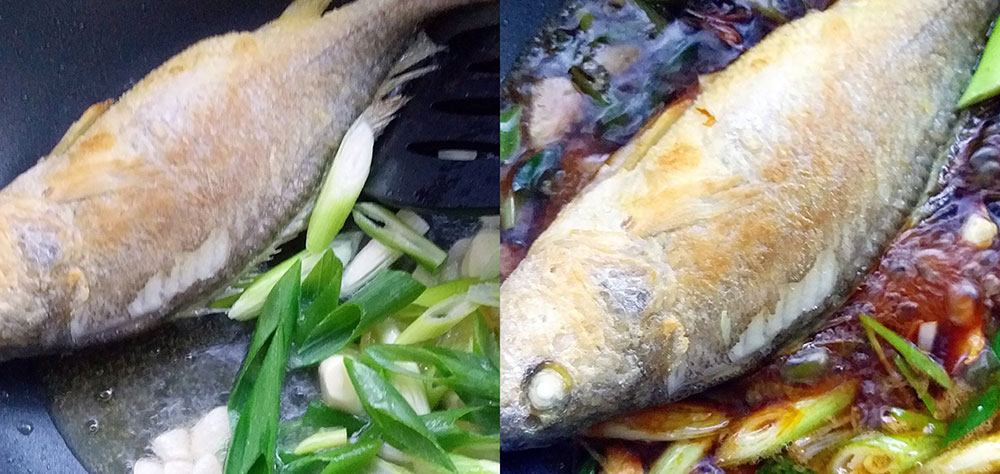 4、魚稍微往邊上放放,撒些蔥姜蒜,扒拉幾下,每樣的香味都出來,繼續烹入生抽,醋,砂糖,些許腌,半碗熱水,湯汁的味道要調到適宜。魚放到湯里,燜十五分鐘。最后轉為大火,使得湯汁濃稠起來,好看入味,輕輕擺入盤中上桌。