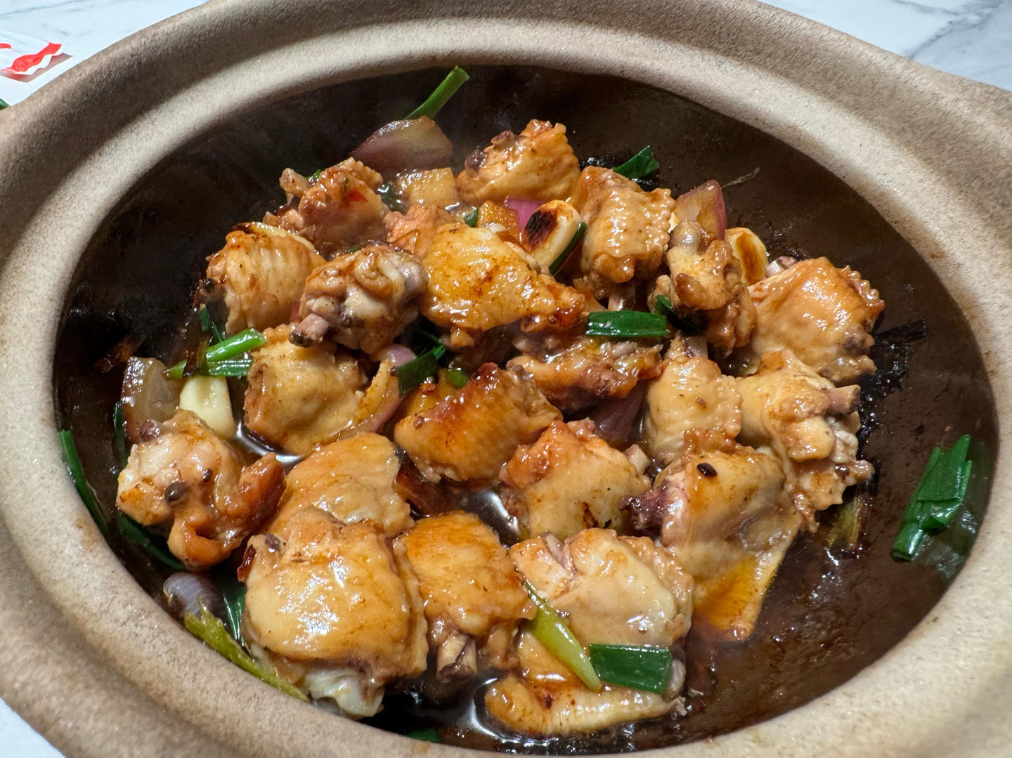 3、鍋底淋些油,多丟些料頭,洋蔥,沙姜,也可以來些小芹菜,把香味烹出來。雞塊放進去,然后蓋住,沿著邊緣淋一圈黃酒,燜半小時,熟透即可。