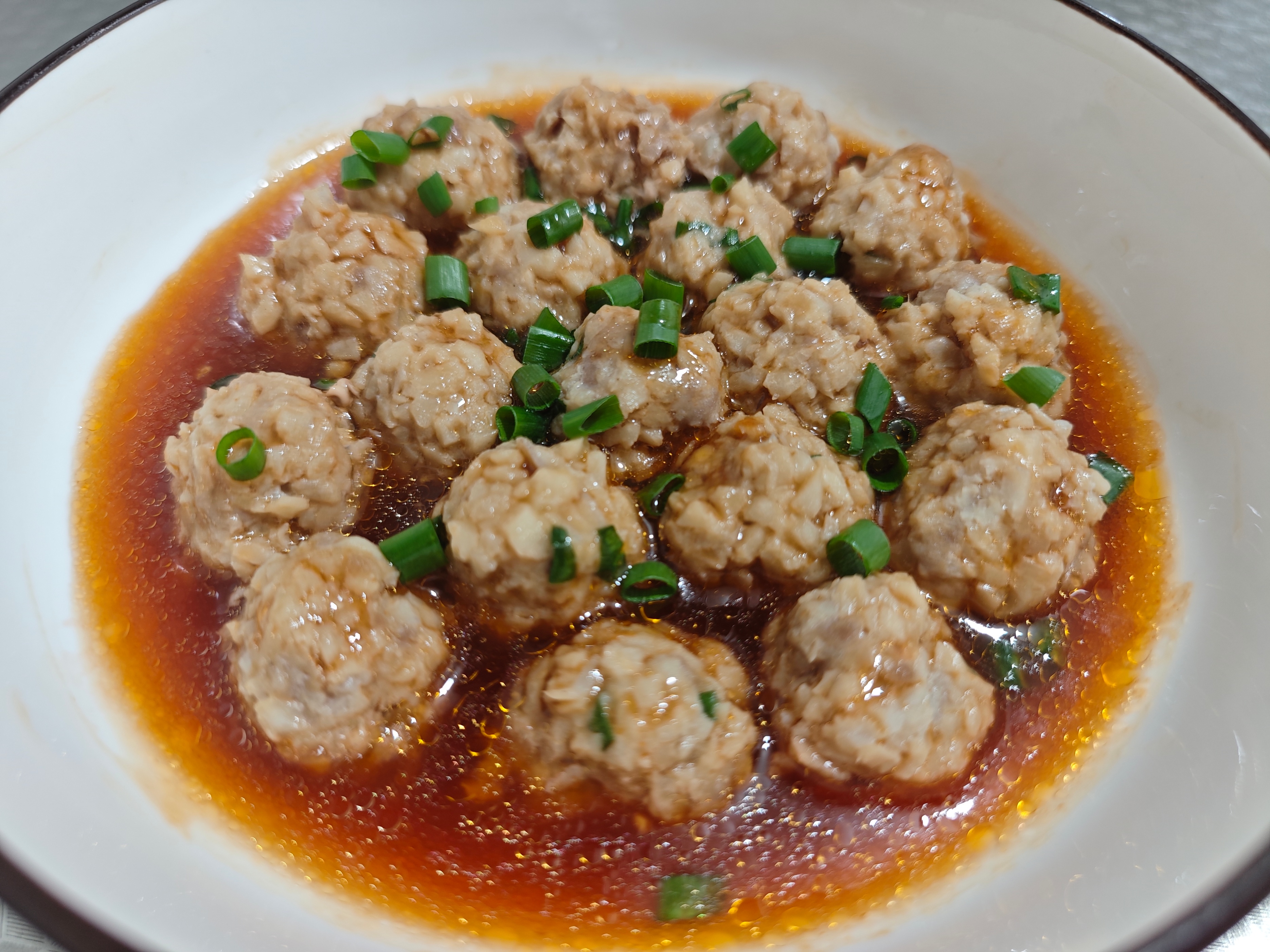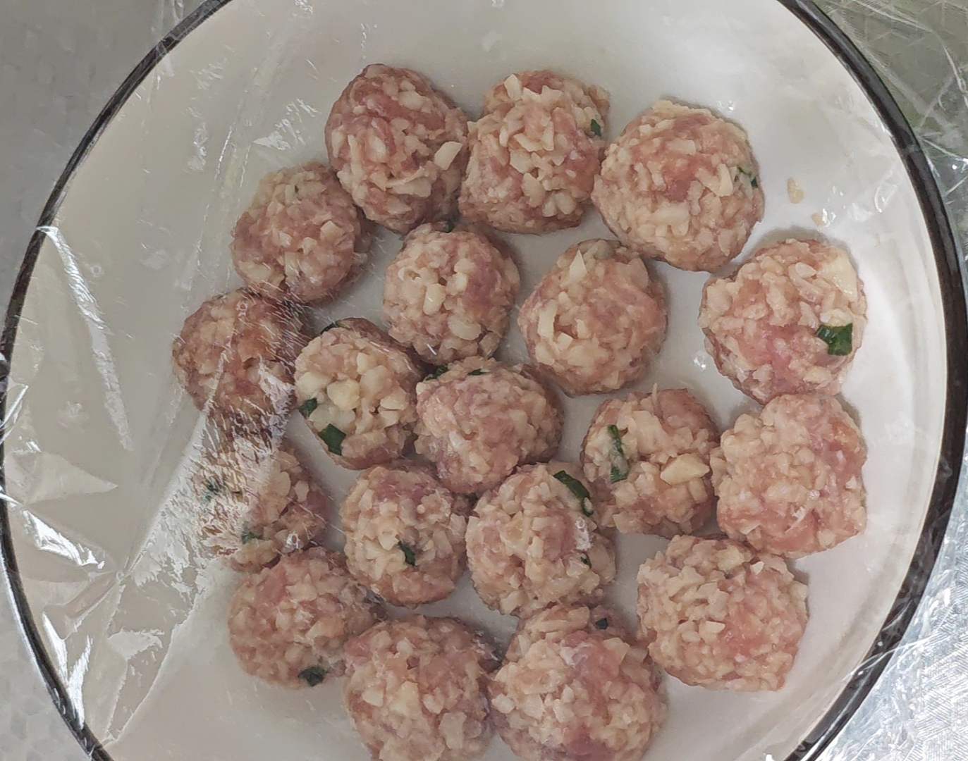 3、藕放到肉餡里,拌勻,可以抱團的狀態后,搓成小丸子,放到盤子里。并且用保鮮膜包住盤口,端上桌,大火十五分鐘就熟了。