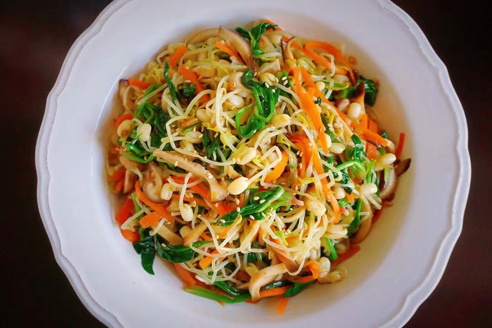 1、分別處理綠豆芽,胡蘿卜,香菇,菠菜,洗好之后,再各自都切好。