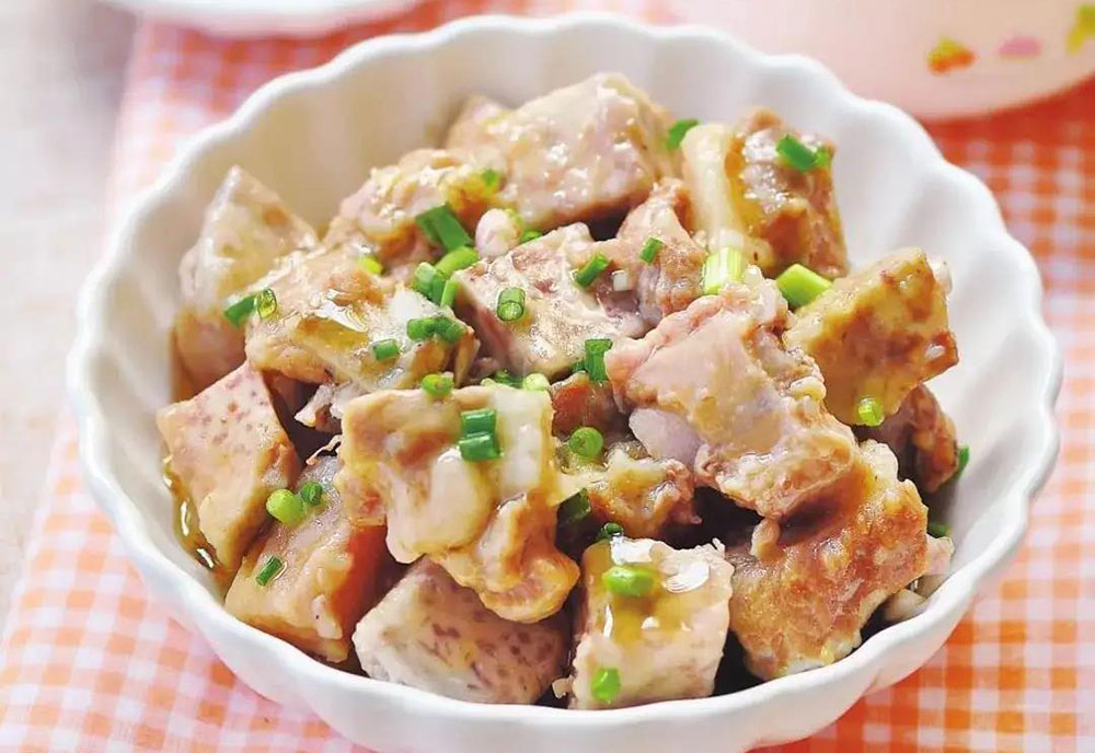 4、屆時把芋頭放在底部,排骨也夾到盤子里邊,端上鍋開始蒸,半小時到三十分鐘就熟了,出鍋加點蔥花即可上桌。