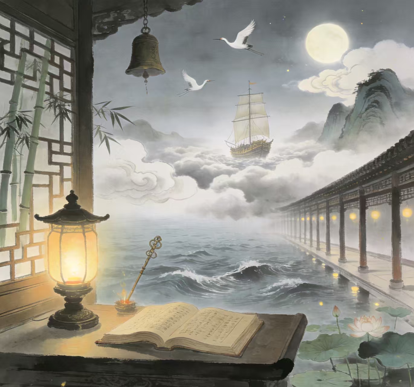 蓮池舊影,竹林遺韻,縱歸來,月滿虛廊。