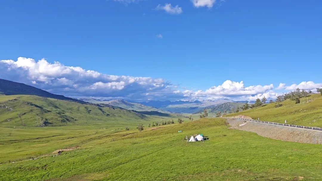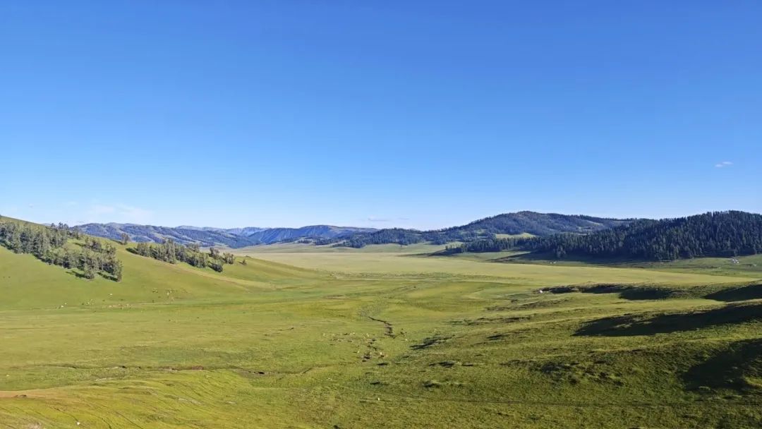 草甸上的野花星星點點,氈房升起炊煙裊裊,牛羊散落在坡上,遠看只剩幾個移動的墨點,倒襯得天地愈發空闊。