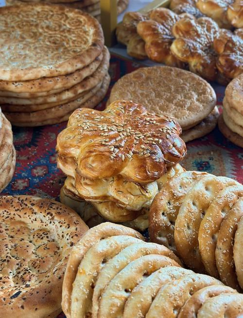 吃完早飯,順著街道溜達,一不小心便溜進馕店。阿勒泰市的馕都藏在小巷里面,每天天剛蒙蒙亮,馕坑就熱鬧了起來,剛出爐的芝麻馕、皮芽子馕正冒著熱氣,外殼酥脆,內里柔軟,咬一口滿是麥香。
