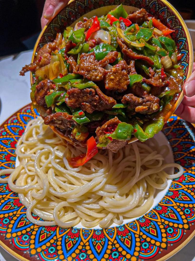 老牌的過油肉拌面必然是拉條子勁道爽滑、過油肉外焦里嫩、白菜和木耳等配菜微卷,混著青紅椒,醬汁稠亮。