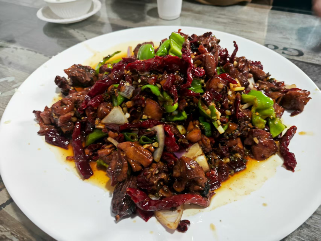 辣子雞是地道麻辣味,雞肉剁成大塊,經熱油爆炒后外焦里嫩,裹著紅亮的辣椒和花椒,咬下去麻香直竄舌尖,越吃越上頭。