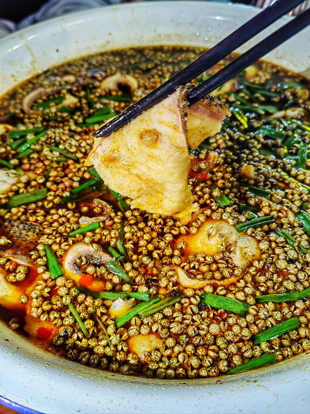 盆盆魚類似水煮魚,卻多了份阿勒泰的豪爽。選用當地新鮮冷水魚,片成厚片,在滾燙的紅湯里燙至斷生,魚肉滑嫩緊實,吸足了湯底的鮮辣,配菜里的魔芋、豆腐、土豆粉也浸滿滋味,筷子翻飛間,唇齒已將肉刺分離,連湯汁都想拌著米飯吞下。
