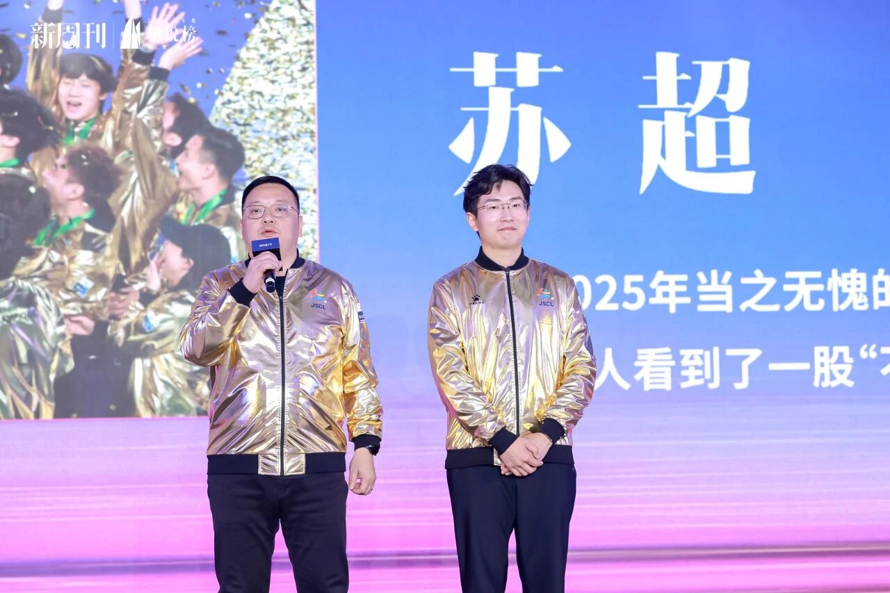 今年新銳榜重磅的“推委會特別榮譽”頒發給了“蘇超”。“蘇超”元年,泰州隊以黑馬之姿一舉奪冠,在現場,泰州市足球協會主席李俊先生,泰州足協理事、蘇超泰州主場MC羅茂誠代表蘇超上臺領取榮譽。