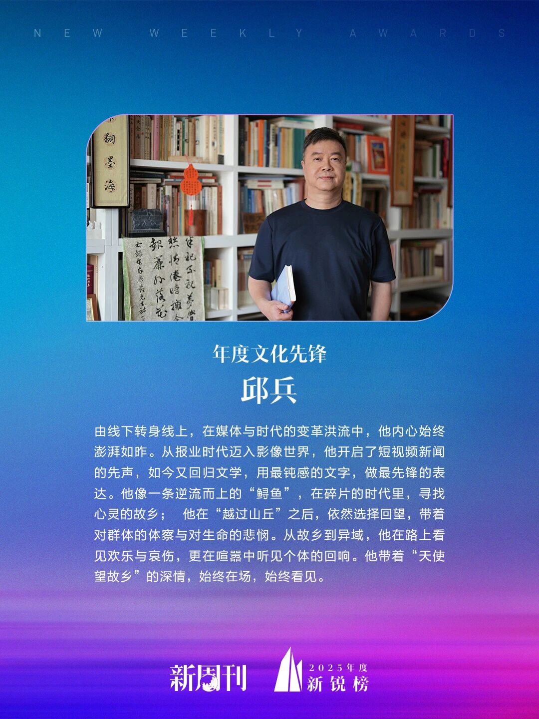 今年《新周刊》新銳榜的重磅榮譽“年度文化先鋒”,頒給了媒體人邱兵。“先鋒”的定義,不僅是沖鋒在前,更有一種穩穩的“鈍感”力。