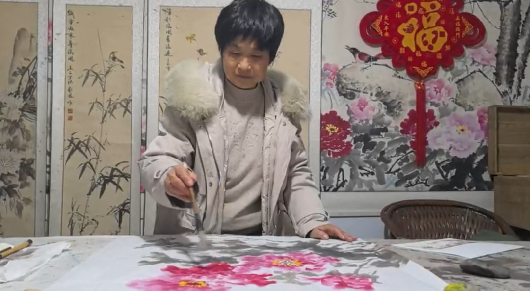 這張畫是昨天畫的,用的筆法是大寫意,牡丹代表富貴吉祥。我就愛畫咱嵩縣的山水花草,把家鄉(xiāng)的美融進筆墨里,心里才踏實。