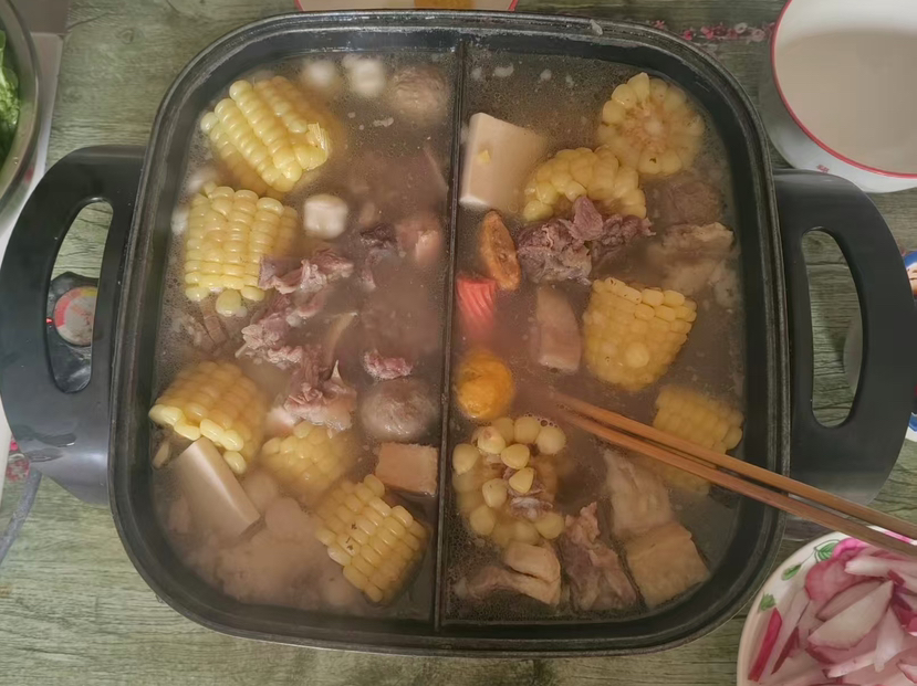 還有吃飯這個鍋,可有年頭,還大有來歷。這是個鴛鴦鍋,不過它是從中間平分的,一邊可以吃辣,一邊可以清湯。