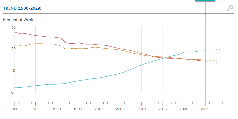 1980年以來,中國(藍)、美國(橙)與歐盟(紅)GDP占全球份額變化,基于購買力平價指數。 圖自:國際貨幣基金組織
