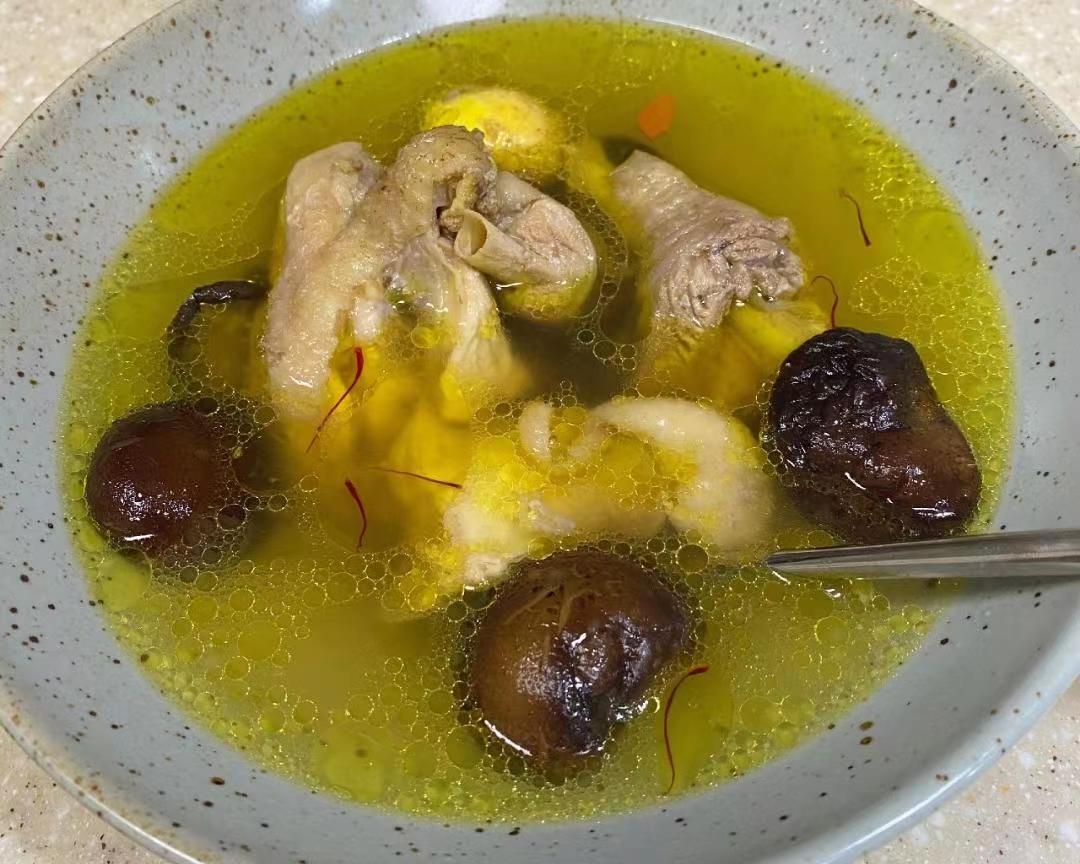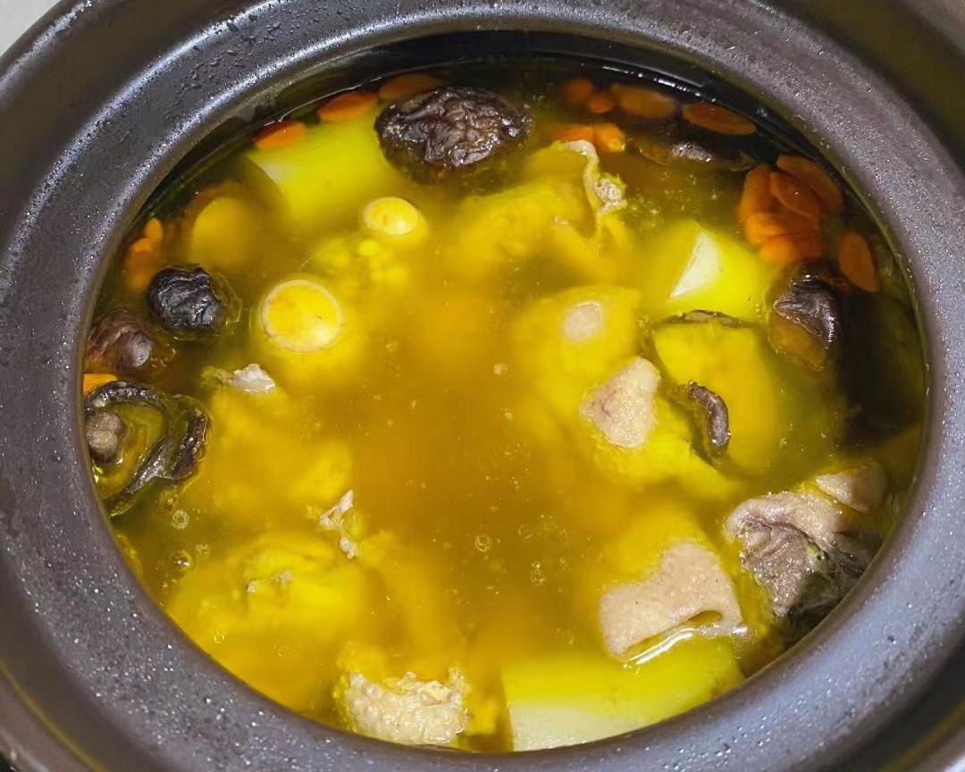 4、之后放到砂鍋里邊,多添上些水,香菇也倒里邊,搭配著蔥姜開始燉,兩個小時左右燉透,加把枸杞,盛到碗里后,可以加點鹽,喝起來特鮮。