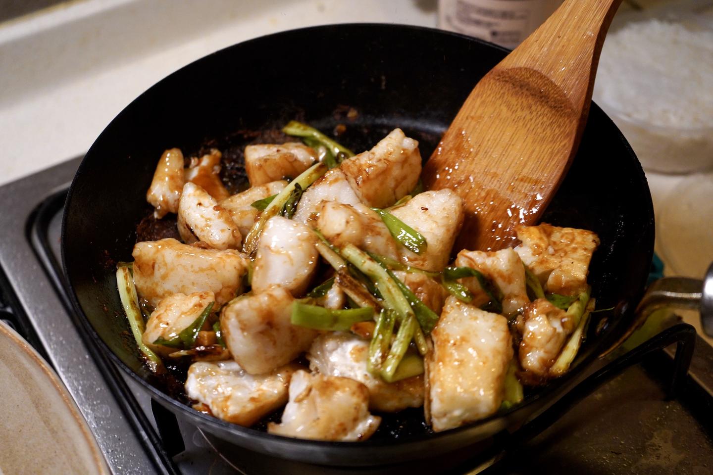 4、繼續往底油里放些香蔥,生抽,醋,糖,炒勻了再加一點熱水,湯汁不用很多,魚塊放里邊,輕輕扒拉,料汁裹到表面,即可關火盛出。
