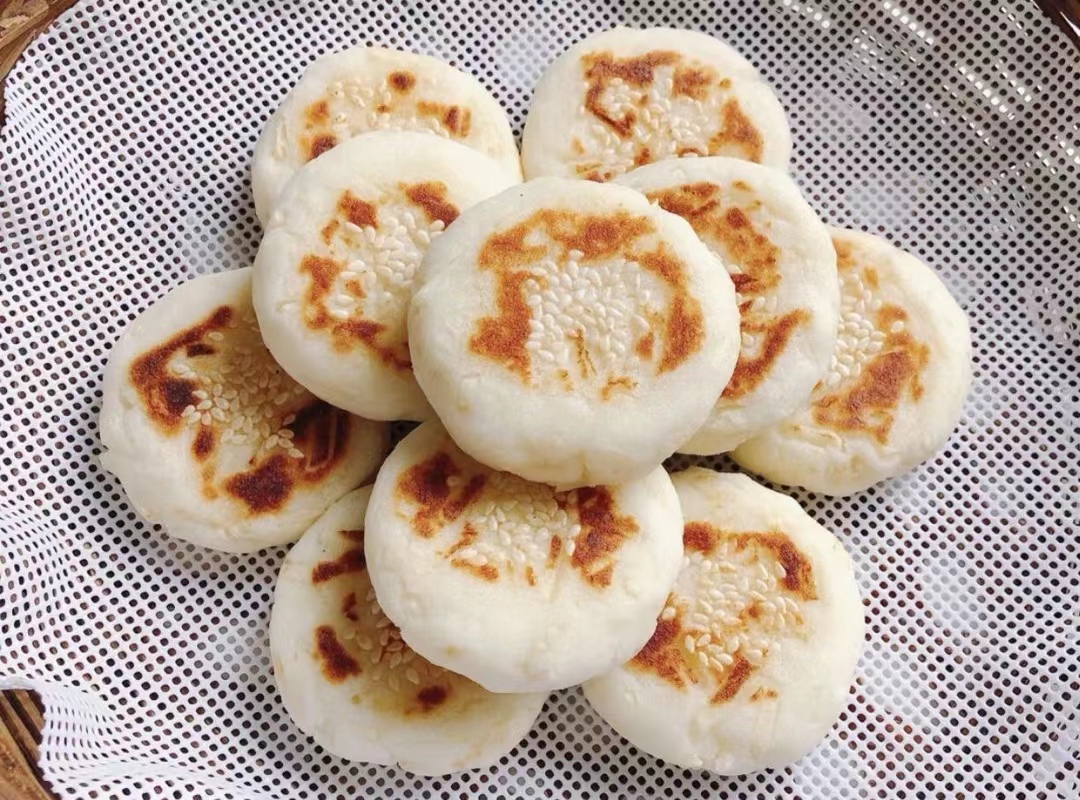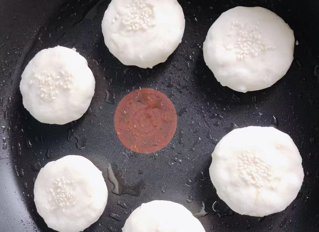 4、十五分鐘后,面團整理成小劑子壓扁。在不粘鍋里,中小火烙,要蓋住鍋蓋,翻一次面,五分鐘左右,體積膨脹,表面上色就熟了。